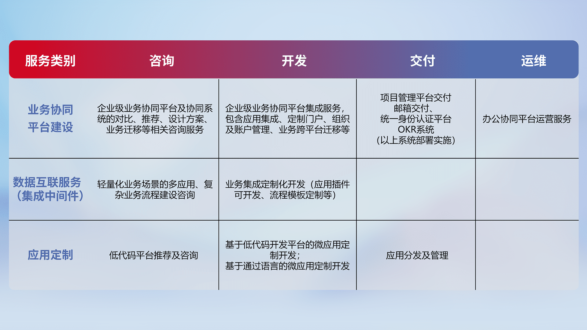 针对钉钉、、企微、、、IDaas等平台级产品提供产品的规划、、、、方案、、、、交付、、、定制化开发等服务,,,实现如统一协同办公、、智能客户服务、、、、混合会议管理、、智能数据查询、、等业务场景,,,实现数字化转型。。